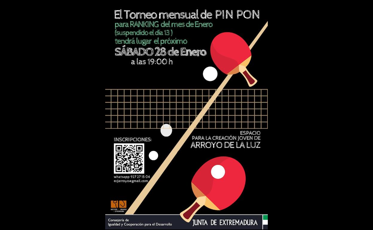 El árbol de juego se celebrará a las 18.45 y el torneo a las 19.00 horasEl Espacio para la Creación Joven de Arroyo de la Luz acogerá hoy sábado, día 28 de enero, una nueva tarde de Torneo de Pin ... Pon. Se trata de la cita suspendida el pasado 13 de enero del torneo mensual para el ranking.