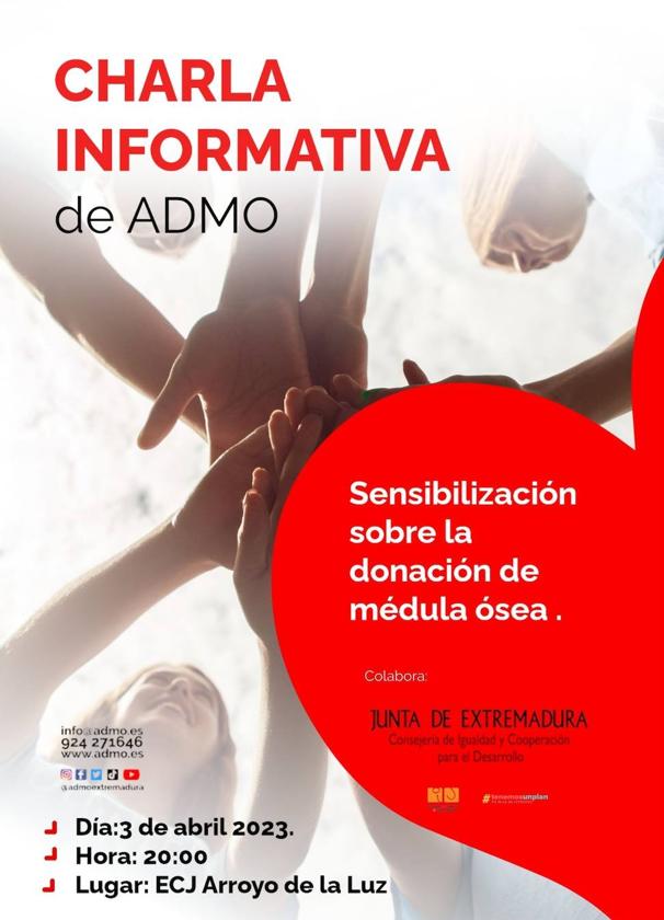 El Espacio para la Creación Joven de Arroyo de la Luz acogerá, el próximo lunes, día 3 de abril, una charla, que ofrecerá ADMO, para ... la sensibilización sobre la donación de médula ósea En la misma, los asistentes podrán conocer de primera mano de ADMO qué fácil puede ser salvar vidas.