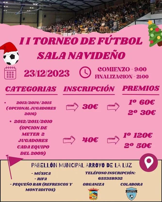 Mañana sábado, día 23 de noviembre, el Pabellón Polideportivo Municipal de Arroyo de la Luz acogerá la segunda edición del Torneo de Fútbol Sala Navideño, una cita organizada por el Ayuntamiento de Arroyo de la Luz con la colaboración del AD Arroyo FS Ferroluz.