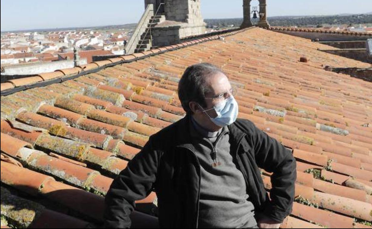 De la oficina de Turismo a la puerta de la iglesia de Arroyo de la Luz apenas hay diez metros de separación, pero en recorrerlos ... con el cura del pueblo se tardan casi diez minutos. «¿Pater, qué tal va la mañana?», «¿cuándo va a subir el próximo vídeo?», «¿ya está listo todo para la misa?». No hay persona que se cruce con él que no se pare. Juanma García (Malpartida de Cáceres, 1961) ya se ha convertido en una seña de identidad de este municipio, uno de los más afectados por la pandemia en la primera ola. Allí murió Claudia debido al coronavirus el 11 de marzo. Fue la primera fallecida de la región y desde entonces el carisma de este párroco, su creatividad y su hazaña desde el tejado del templo bendiciendo los cuatro puntos cardinales han dado la vuelta al mundo.