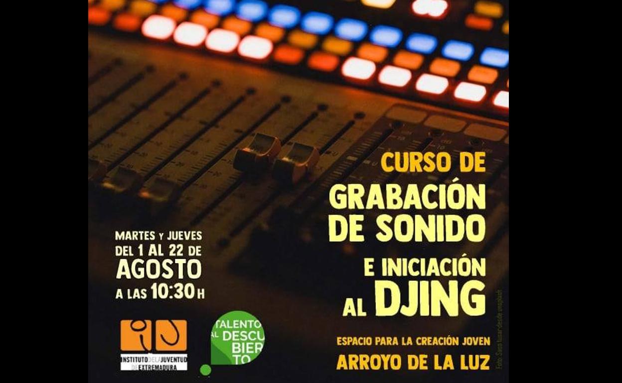 Durante los martes y los jueves del mes próximo mes de agosto, el Espacio para la Creación Joven de Arroyo de la Luz acogerá un ... curso de Grabación de Sonido e Iniciación al Djing, dentro de los cursos que el Instituto de la Juventud de Extremadura está llevando a cabo en varias localidades a través del programa 'Talento al Descubierto'.