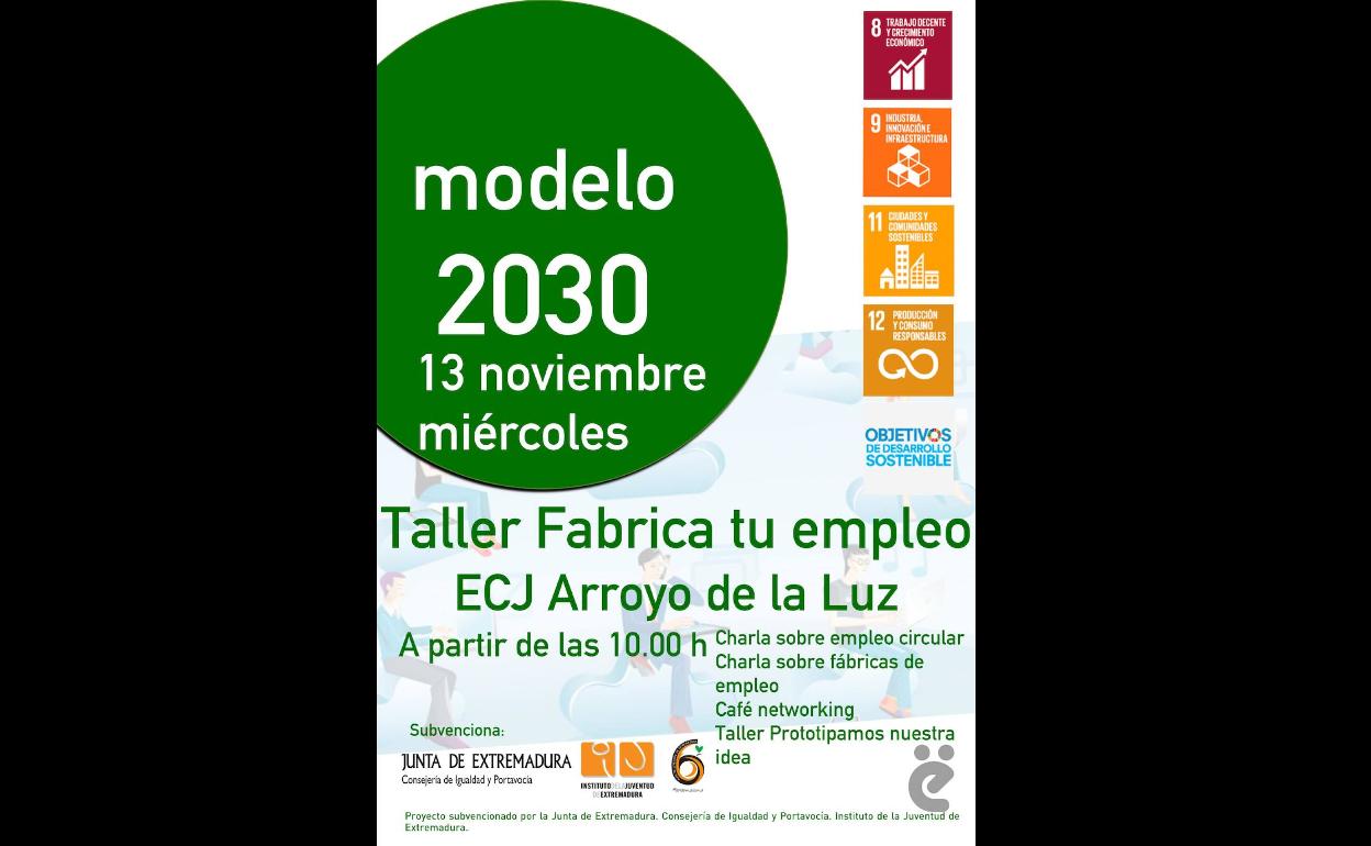 Mañana miércoles, día 13 de noviembre, a las 10.00 horas, el Espacio para la Creación Joven de Arroyo de la Luz acogerá el taller ' ... Fabrica tu empleo Modelo 2030', una actividad dirigida a estudiantes de Educación Secundaria Obligatoria, principalmente para los estudiantes de Ciclo Formativo de Grado Superior de Administración y Finanzas y para estudiantes de Ciclo Formativo de Grado Medio de Gestión Administrativa.