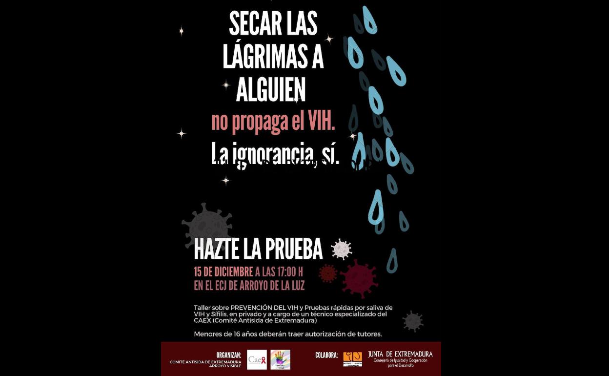 Hoy miércoles, día 15 de diciembre, el Espacio para la Creación Joven de Arroyo de la Luz acogerá un taller sobre Prevención del VIH, bajo ... el título 'Secar las lágrimas a alguien no propaga el VIH. La ignorancia, sí'.