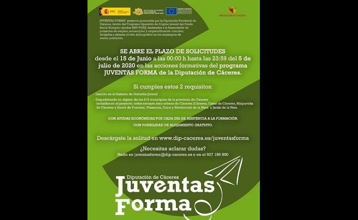 La solicitud puede descargarse en www.dip-caceres.es/juventasforma, poniendo a disposición de quienes precisen más información el correo electrónico juventasforma@dip-caceres.es y el teléfono 927 189 800.