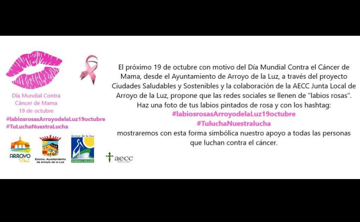 Dentro del mismo marco, el Ayuntamiento de Arroyo de la Luz, a través del proyecto Ciudades Saludables y Sostenibles, y contando con la colaboración de la Junta Local de la AECC de Arroyo de la Luz, propone una acción de visibilización inundando las redes sociales de 'labios rosas', de forma que se suba una fotografía con los labios pintados de color rosa y con los hasthtag #labiosrosasArroyodelaLuz19octubre, #TuluchaNuestraLucha, como muestra de apoyo a todas las personas que luchan contra el cáncer.