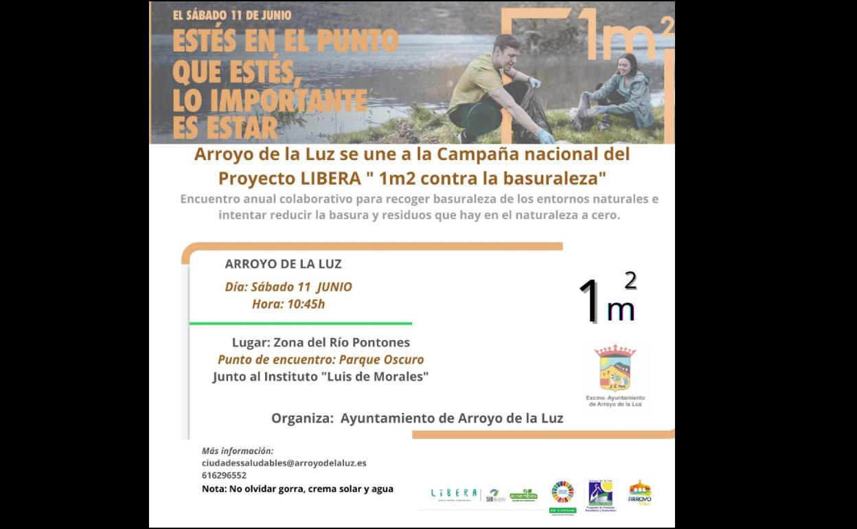 Mañana sábado, día 11 de junio, Arroyo de la Luz participará en la campaña de nivel nacional del Proyecto Libera '1m2 contra la basuraleza', de forma que todas las personas que lo deseen podrán poner su granito de concienciación recogiendo su metro cuadrado de residuos.