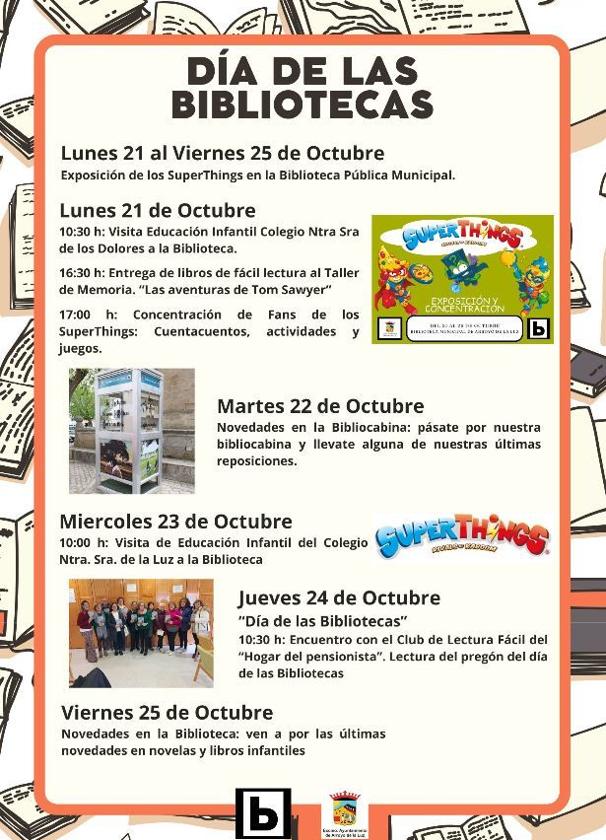 Ya el jueves, día 24 de octubre, se celebrará el 'Día de las Bibliotecas' con un encuentro, a las 10.30 horas, con el Club de Lectura Fácil del Hogar del Pensionista y la lectura del pregón del Día de las Bibliotecas.