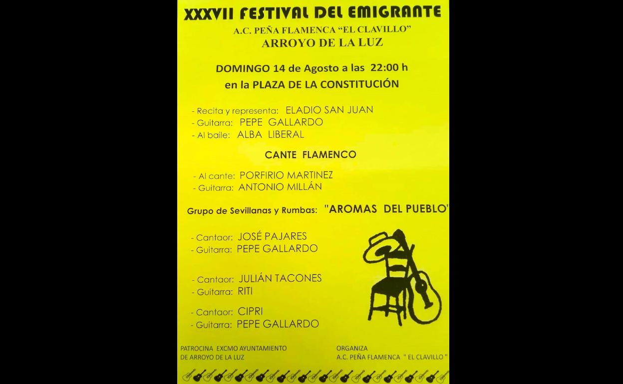 Dentro de dicho contexto, el próximo domingo, día 14 de agosto, se celebrará en la Plaza de la Constitución, a las 22.00 horas, el XXXVII Festival Flamenco del Emigrante, organizado por la Peña Flamenca 'El Clavillo con la colaboración del Ayuntamiento de la localidad.