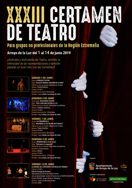 Desde el día 1 del próximo mes de junio y hasta el 14, Arroyo de la Luz acoge la XXXIII del Certamen de Teatro para ... grupos no Profesionales de la Región de Extremadura, organizado, un año más, por el Ayuntamiento de la localidad cacereña con la colaboración de la Diputación de Cáceres y de la Consejería de Cultura de la Junta de Extremadura.