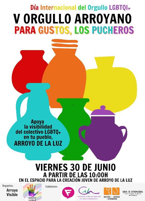 El próximo viernes, día 30 de junio, la asociación Arroyo Visible, de Arroyo de la Luz, organizará el V Orgullo Arroyano bajo el título 'Para ... gustos, los pucheros'. Como en las anteriores ocasiones, las distintas actividades que se organizarán se llevarán a cabo en las instalaciones del Espacio para la Creación Joven de la localidad.