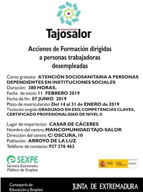 El Ayuntamiento de Arroyo de la Luz ha informado, a través de la aplicación web Bandomóvil, sobre el comienzo del curso de Atención Sociosanitaria a ... Personas Dependientes en Instituciones Sociales, dentro de las acciones de formación dirigidas a personas trabajadoras desempleadas de la Mancomunidad Tajo-Salor.