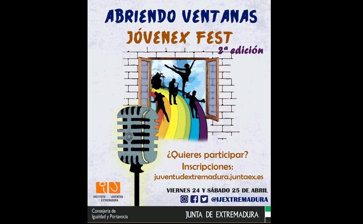 Desde el Espacio para la Creación Joven de Arroyo de la Luz invitan a todos a pasar un fin de semana diferente disfrutando de la ... segunda edición de 'Abriendo Ventanas Jóvenes Fest', donde, a través de las redes sociales, se podrá disfrutar de contenidos musicales, lecturas, monólogos, danza o poesía, entre otros. Las actuaciones son en directo y pueden seguirse a través del canal de Instagram de cada artista.