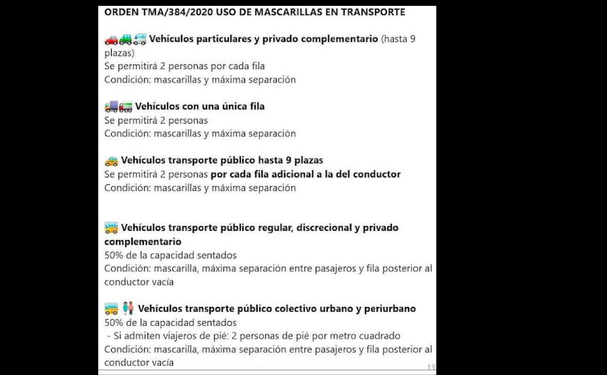 Vehículos de transporte público colectivo urbano y periurbano: se permite ocupar el 50% de las plazas sentados. Se admiten viajeros de pie, siempre que haya 2 personas de pie por metro cuadrado. Es obligatorio el uso de mascarilla, guardar la máxima separación entre pasajeros y dejar vacía la fila posterior al conductor.