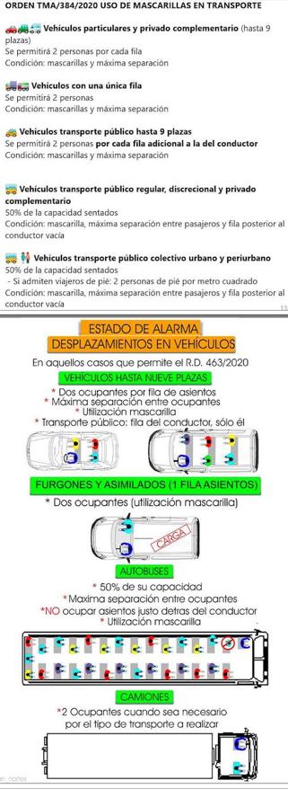 Vehículos de transporte público hasta 9 plazas: se permitirá 2 personas por cada fila adicional a la del conductor, con mascarillas y guardando la máxima separación posible.