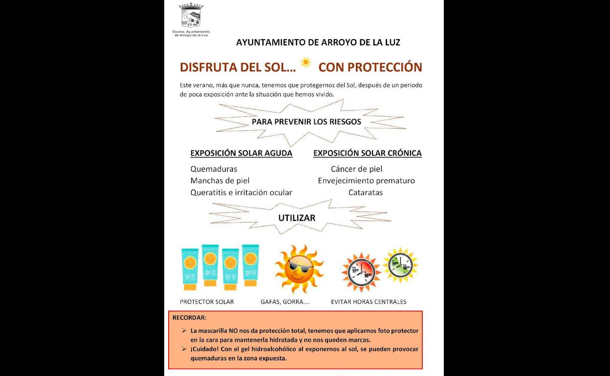 El Ayuntamiento de Arroyo de la Luz, a través de la oficina de Ciudades Saludables y Sostenibles, área de la Concejalía de Salud, recuerda que este verano, más que nunca, tenemos que protegernos del sol, después de un periodo de poca exposición ante la situación que hemos vivido.
