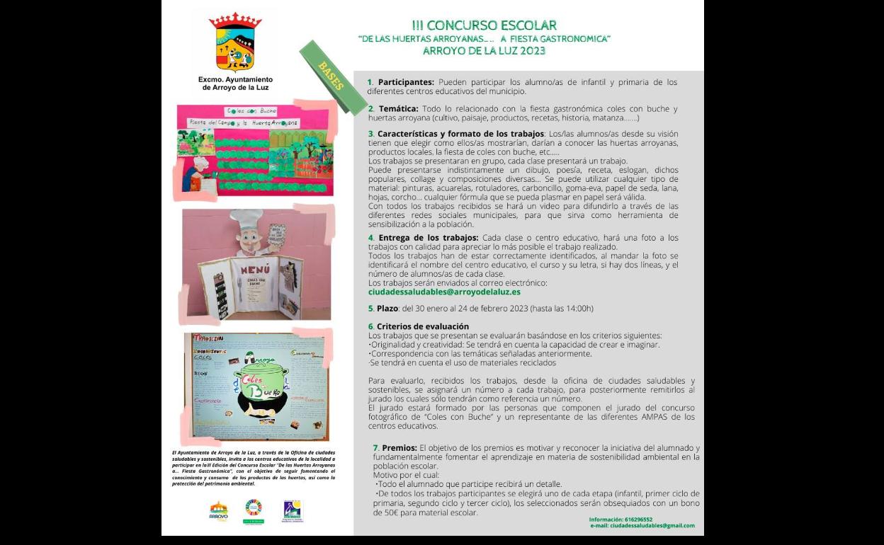 El concurso se enmarca dentro de las actividades organizadas con motivo de la Fiesta Gastronómica de las Coles con BucheEl Ayuntamiento de Arroyo de la Luz, a través de la Oficina de ciudades saludables y sostenibles, ha vuelto a poner en marcha un año ... más, dentro del contexto de la celebración de la Fiesta Gastronómica de las Coles con Buche, el III Concurso Escolar 'De las Huertas Arroyanas a Fiesta Gastronómica'. Al mismo, han invitado a los centros educativos a participar con el mismo objetivo que se hizo en los años anteriores; continuar dando a conocer a las nuevas generaciones las tradiciones y el consumo de los productos de la huerta local, así como la protección del patrimonio ambiental.