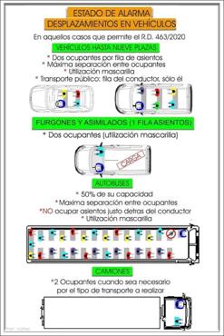 En los vehículos de hasta 9 plazas deberán ir dos ocupantes máximo por cada fila de asientos, con la máxima separación posible entre los ocupantes. Deberá usarse mascarilla y en el caso del transporte público, en la fila del conductor irá solo dicho conductor.