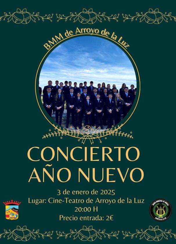 Como cada año, la Banda de Música Municipal de Arroyo de la Luz dará la bienvenida al nuevo año 2025 con su ya tradicional Concierto de Año Nuevo, que este año se celebrará el día 3 del próximo mes de enero, a las 20.00 horas.