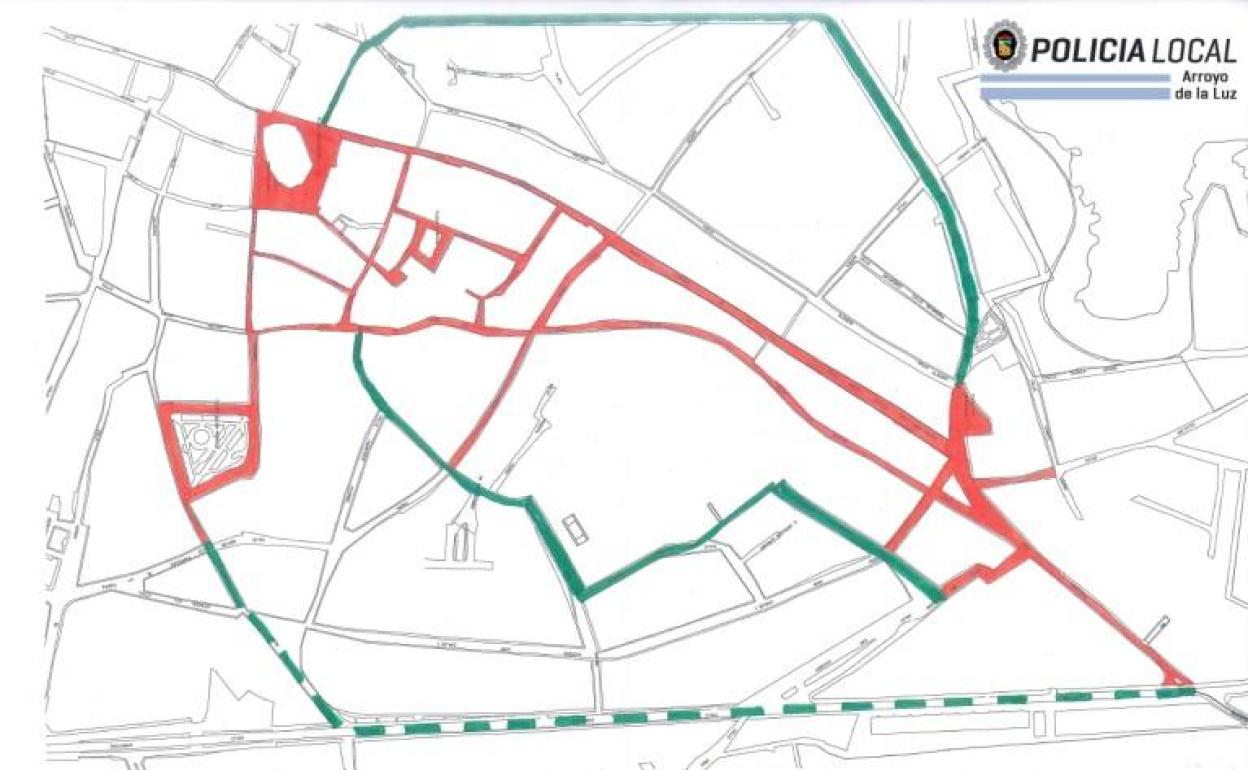 Estas calles son; la Plazuela y Plaza de San Sebastián, la calle San Sebastián, calleja del Reloj, calle Juan Muñoz Chaves, calle Virgen de la Luz, calle Luis Chaves, calle Camberos, calle Hilacha, calle Gabriel y Galán, plaza Divino Morales, calle Rafael Chaparro y plaza de la Constitución.