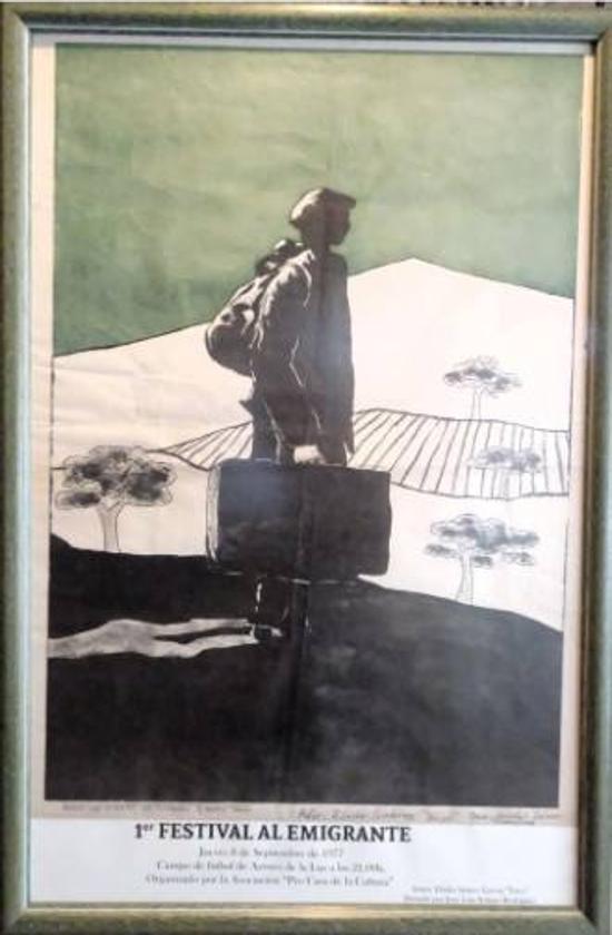 Ese cartel, evocación y homenaje al arroyano emigrado, como tantos extremeños, sobre un campo vacio, casi yermo, con colores de muerte, indiferencia y bajo un cielo de esperanza – de los que se hablaba sería la futura bandera extremeña, que, según cuentan ciertas lenguas, surgió por los de los equipos de futbol de Badajoz y Cáceres- , cruzado en su marcha por un paisano de escueto traje y con una maleta en la que porta su escaso «jato» en busca de un futuro mejor para su entorno. Diseñado por Eladio Suárez García, «Yayo», para que, sobre plancha de cobre, se imprimiera a dos colores y anunciara el evento a celebrar en el campo de futbol de la localidad, como también lo haría en siguientes ediciones. Localizado entre mis enseres, me es grato donar este documento histórico para su exposición pública de forma permanente, esperando que la familia Suárez García pueda encontrar la plancha que sirvió de base a su imprimación, así como los bocetos previos a ella para que tengan el mismo fin público y cultural que se pretendió siempre.