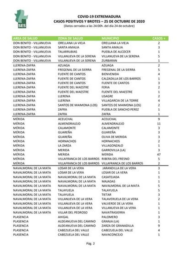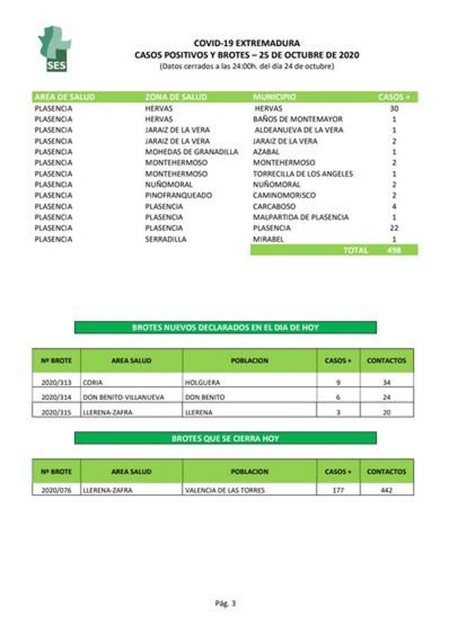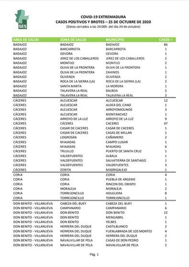 La región notifica este 25 de octubre 498 positivos confirmados por PCR, solo dos menos que ayer, cuando se alcanzó el máximo diario de la ... pandemia (500). La localidad que más contagios comunica hoy es Badajoz, con 86, seguida de las ciudades de Cáceres y Mérida, con 47 cada una. También es muy alta la cifra de Hervás, con 30 casos en un día. Don Benito y Plasencia añaden 22, respectivamente; y Almendralejo suma 11.