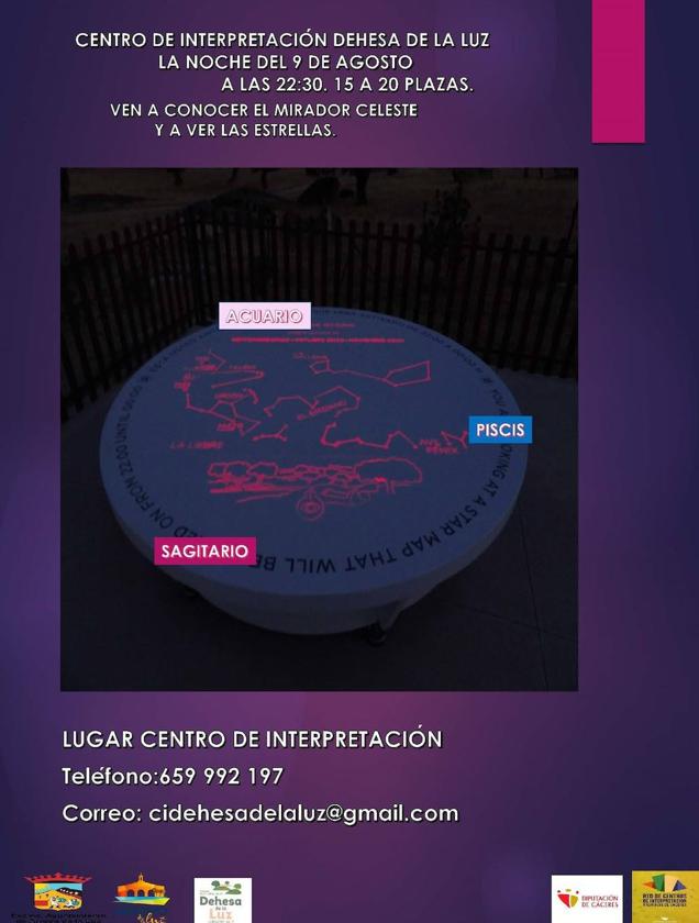 El próximo viernes, día 9 de agosto, dentro de las actividades que integran el programa Festivarroyo organizado por el Ayuntamiento de Arroyo de la Luz, se podrá disfrutar del cielo estrellado de la localidad desde el mirador celeste del Centro de Interpretación Dehesa de la Luz.