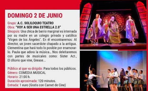 Hoy domingo continúan las representaciones del certamen, esta vez con una comedia musical del grupo 'Soliloquio Teatro', que representarán 'Voy a ser una estrella 2.0', en la que una chica de barrio marginal es internada por su madre en un colegio privado y católico en el que encontrará a un joven director y sacerdote chapado a la antigua. Clementina, la protagonista, hará todo lo posible para enamorarlo, Paula que adora la música… El acompañamiento musical ofrecerá canciones como Sister Act., El diluvio que viene, Grease,…