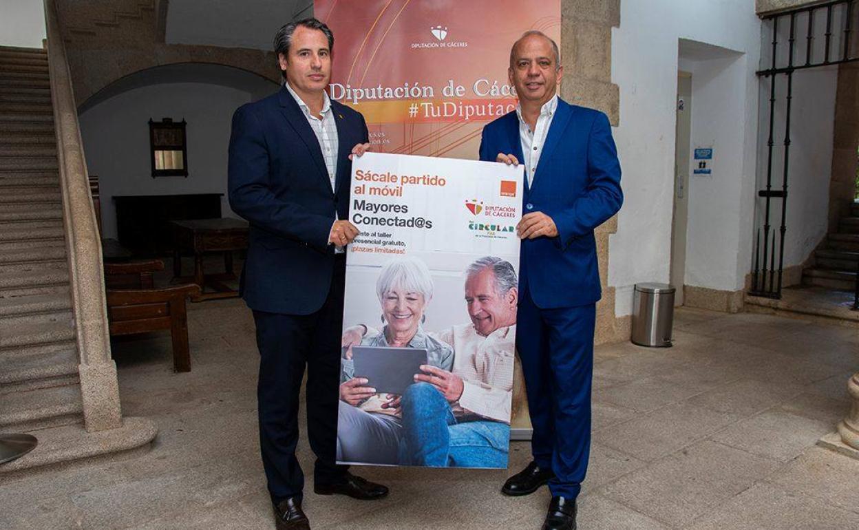 El diputado de Innovación y Provincia Digital de la Diputación de Cáceres, Santos Jorna, y el director territorial de Relaciones Institucionales de Orange, Raúl Maldonado, han presentado el convenio firmado por ambas entidades para impartir formación sobre tecnología a personas mayores, «con el fin de avanzar en el cierre definitivo de la brecha digital intergeneracional», como ha indicado Jorna.