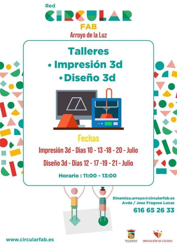 El Circular FAB de Arroyo de la Luz va a poner en marcha dos talleres durante el mes de julio; uno de Impresión 3D y ... otro de Diseño 3D, de tal forma que los asistentes aprenderán a hacer sus propios modelos para tenerlos físicamente.