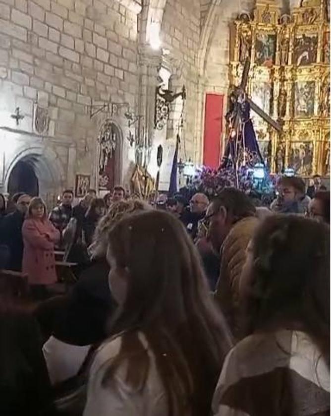 Así, los costaleros sacaron al Nazareno, que hizo el paso hasta el altar y recorrió el pasillo central de la iglesia seguido por un grupo de mujeres descalzas, y acudiendo a su encuentro la Verónica. Con las imágenes una frente a otra se descubrió el pañuelo que esta porta entre sus manos y se descubrió la cara de Cristo en el mismo.