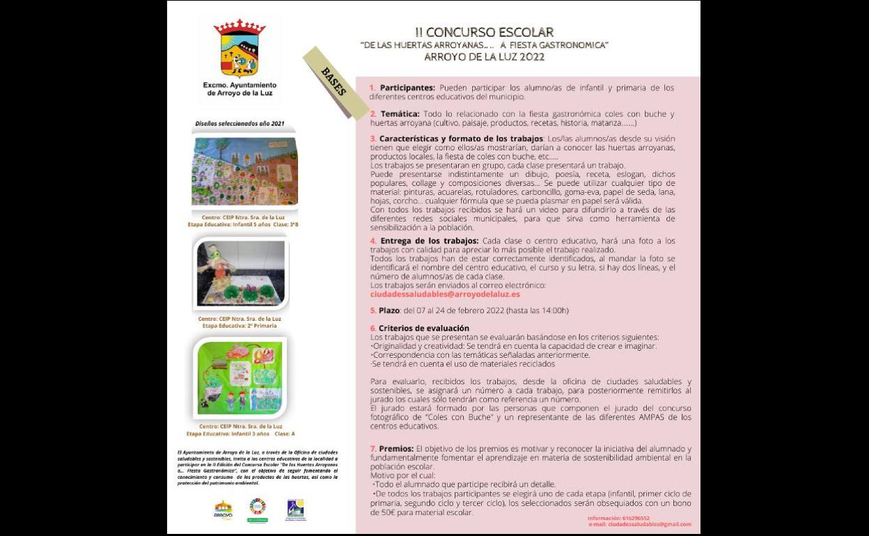 Pueden participar los alumnos de infantil y primaria de los diferentes centros educativos del municipio, siendo la temática todo lo relacionado con la fiesta gastronómica coles con buche y huertas arroyana (cultivo, paisaje, productos, recetas, historia, matanza…).