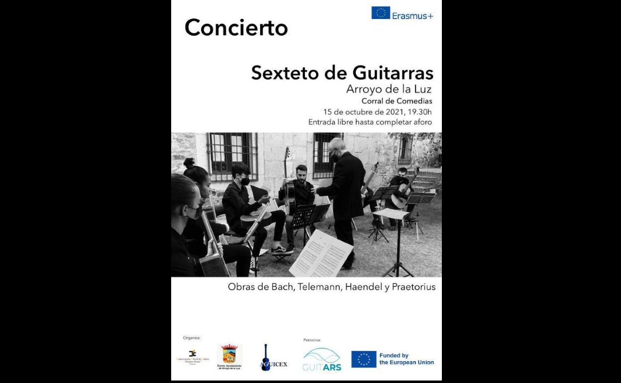 Mañana viernes, día 15 de octubre, el Corral de Comedias de Arroyo de la Luz acogerá el concierto Sexteto de Guitarras a las 19.30 ... horas, organizado por el Ayuntamiento de la localidad, Aguicex y el Conservatorio Oficial de Música Hermanos Berzosa de Cáceres, con el patrocinio de Guitars y Funded by European Union.