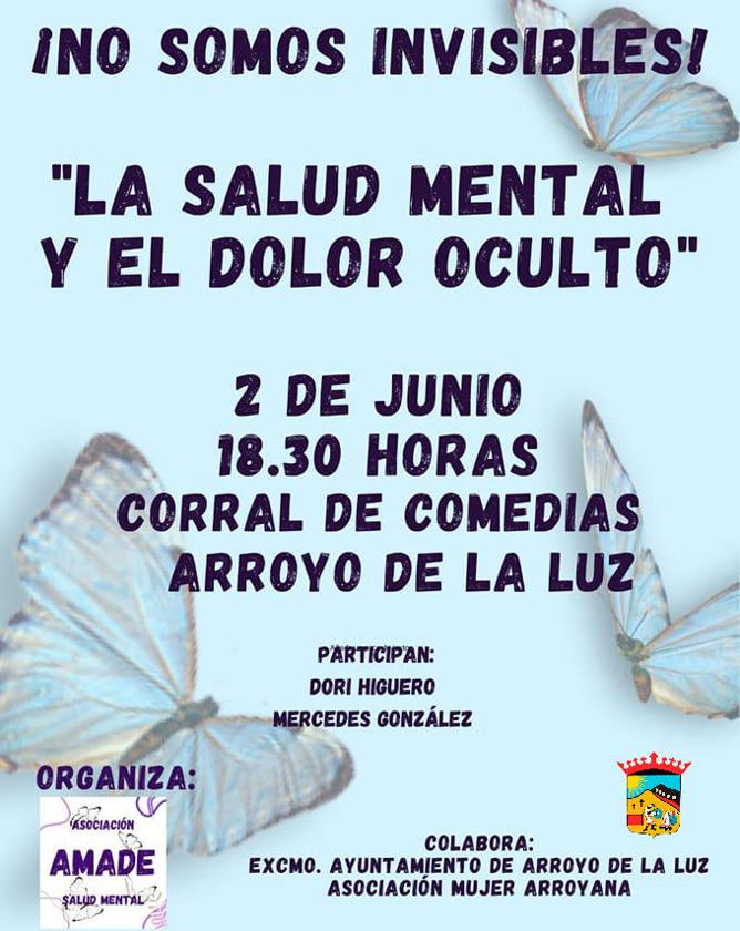 El próximo viernes, día 2 de julio, se celebrará en Arroyo de la Luz la charla 'No Somos Invisibles: La Salud Mental y El Dolor ... Oculto', organizada por la Asociación AMADE Extremadura, con la colaboración de la asociación Mujer Arroyana y del Ayuntamiento de la localidad.