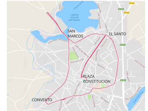 Con dicho objeto, los vehículos no podrán circular por la Plaza de la Constitución, calle Luis Chaves, Virgen de la Luz, Juan Muñoz Chaves, Plaza de San Sebastián, calle San Sebastián, Juan Carlos I, Plaza San Antón, calle San Antón, Plaza Divino Morales, Virgen de Guadalupe, calle Casas Nuevas, calle Escuelas Nuevas, calle San Francisco, Convento, Huertas, calle Castillo, Ronda Condejo, Diseminado Charca Grande, calle San Marcos, calle la Charca y el vial de la ermita hasta el Pozo.