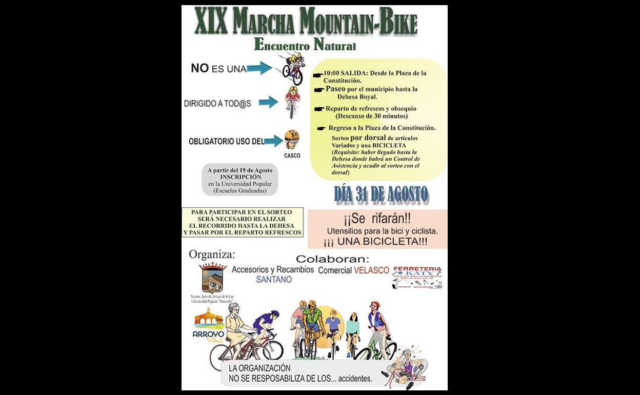 Hoy lunes, 19 de agosto, se ha abierto el plazo para inscribirse en la 'Marcha Mountain Bike, Encuentro Natural' de Arroyo de la Luz, que ... este año cumple la edición número 19. Las inscripciones se recogen en la Universidad Popular, en horario de 10.00 a 14.00 horas.