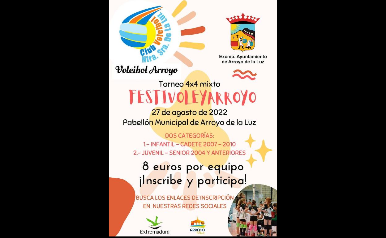 El próximo 27 de agosto, dentro de los eventos organizados con motivo de las fiestas de verano de Arroyo de la Luz recogidas en el programa Festivarroyo, tendrá lugar el Torneo Mixto 4x4 Festivoleyarroyo, organizado por el Ayuntamiento de Arroyo de la Luz y el Club de Voleibol Nuestra Señora de la Luz.