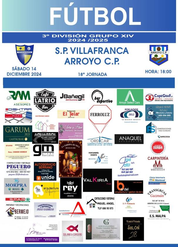 Los arroyanos ocupan el puesto 15 en la clasificación y los de Villafranca el 7El próximo sábado, día 14 de diciembre, el Arroyo CP enfrentará el que será el encuentro correspondiente de la jornada 15 de la actual liga de Tercera División desplazándose para enfrentarse al Villafranca.