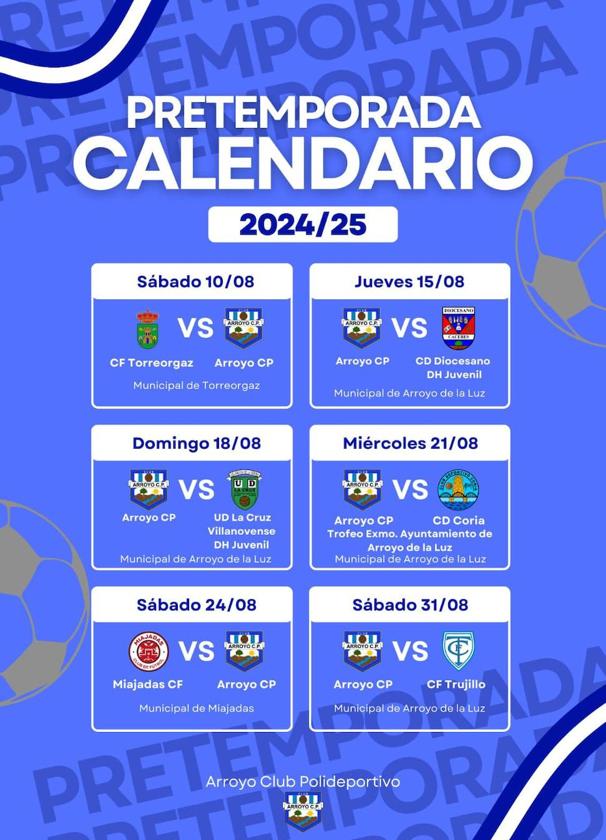 El sábado 24 de agosto se desplazarán para enfrentarse al Miajadas CF y el sábado 31 de agosto recibirán en el Municipal de Arroyo de la Luz al CF Trujillo.