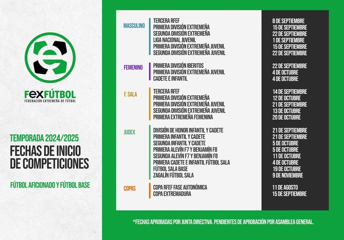 La Federación Extremeña de Fútbol ha anunciado ya las fechas de inicio de las diferentes competiciones, tanto de fútbol aficionado como de fútbol base, las cuales han sido aprobadas por la Junta Directiva, encontrándose pendientes de aprobación por la Asamblea General.