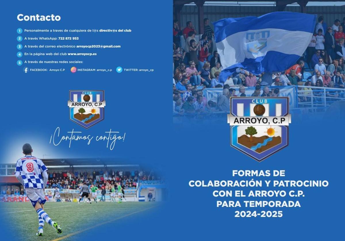 A través de un díptico explican que hay diferentes formas de colaborar por medio del patrocinio; publicidad en la equipación, en el estadio, en la cartelería de los partidos o con artículos donados para las rifas. Además de las formas habituales, han presentado nuevas formas como es publicidad en el libro que publicarán sobre la historia del club, publicidad en el programa 'La Red', de Radio marca, en las retransmisiones de los partidos por TV Arroyo, publicidad en el calendario 2025, en el photocall de ruedas de prensa después de los partidos o en la revista mensual del Arroyo CP.