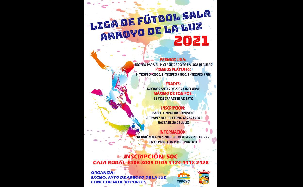 El Ayuntamiento de Arroyo de la Luz, a través de la concejalía de Deportes, ha convocado la Liga de Fútbol Sala 2021, en la que ... podrán participar un máximo de 12 equipos con jugadores nacidos antes del 2005.