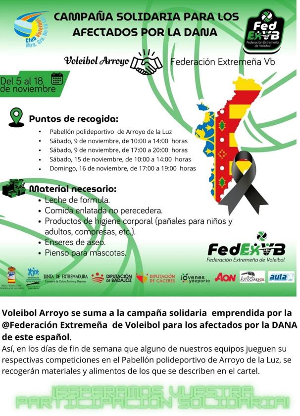 La federación, con la colaboración de varios clubes, está llevando a cabo una recogida de ayuda para los afectados por la danaEl Club de Voleibol de Arroyo de la Luz se ha unido a la campaña solidaria de ayuda a los afectados por la Dana del levante español que ha puesto en marcha la Federación Extremeña de Voleibol.