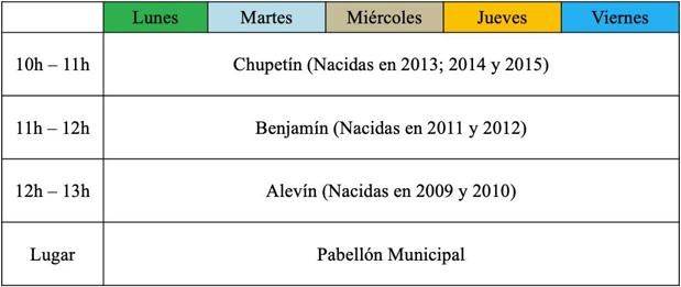 Para esta vuelta a la actividad, se seguirán los protocolos sanitarios vigentes y se ha tomado la precaución de realizar grupos estables de trabajo de una hora de duración. Así las «chupetines»(1º y 2º de Primaria) estarán activas de 10 a 11 de la mañana, les seguirán las benjamines (3º y 4º de Primaria) de 11 a 12 de la mañana y finalizarán la jornada diaria las alevines (5º y 6º de Primaria) de 12 a 13 horas, desde el 21 de junio (lunes) hasta el viernes 25 de junio, que a las 12 de la mañana, será cuando el alcalde, Carlos Caro, clausurará las jornadas por este año.