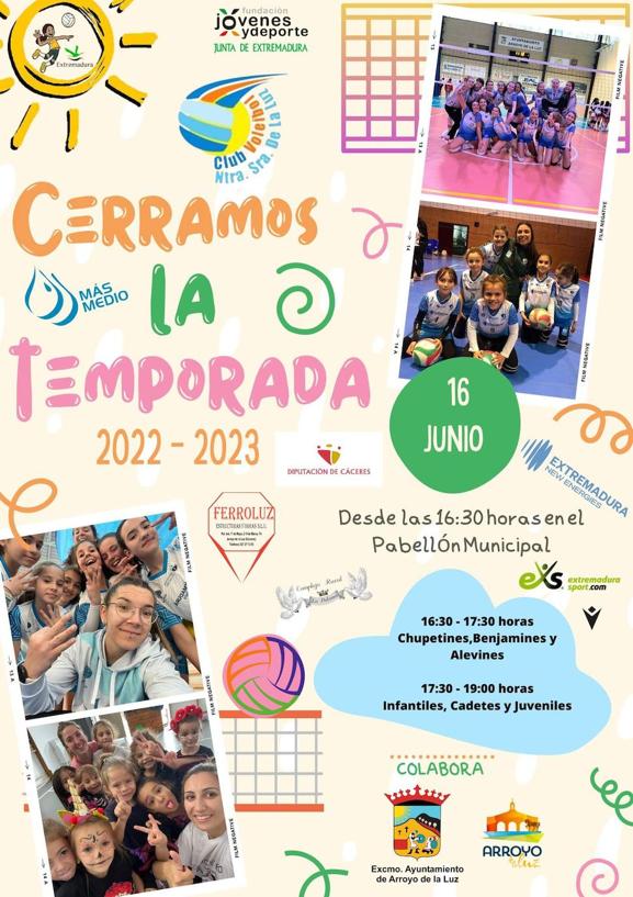 Comenzarán las chupetines, benjamines y alevines y les seguirán las infantiles, cadetes y juvenilesEl próximo viernes, día 16 de junio, el club de voleibol Nuestra Señora de la Luz, de Arroyo de la Luz, dará por cerrada la ... temporada, finalizando con las sesiones de entrenamiento de los equipos de la cantera.