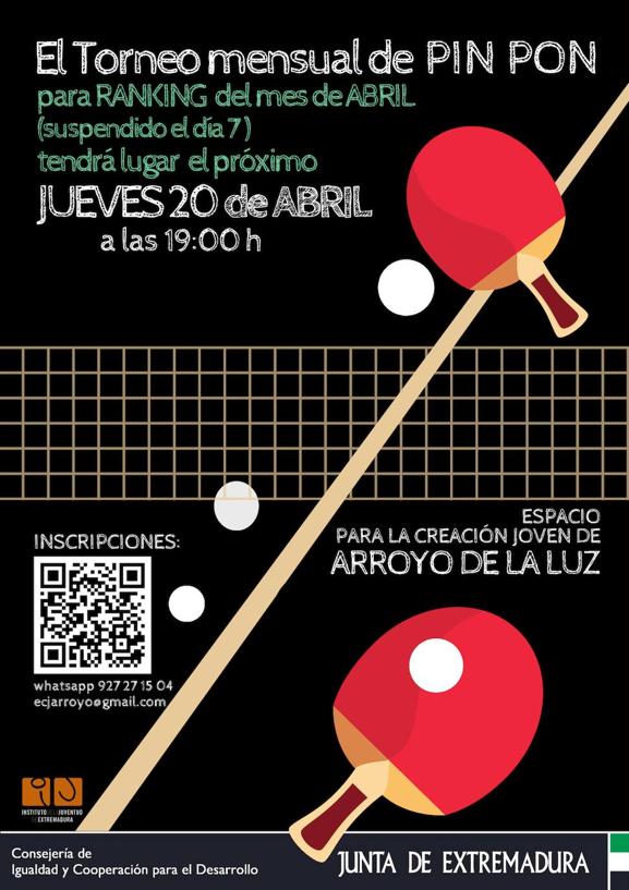 El torneo comenzará a las 19.00 horasEl ECJ continúa con su Torneo Mensual de Pin Pon y en esta ocasión, debido a que durante el fin de semana se celebrará la ... romería de la Virgen de la Luz, han decidido adelantarlo al jueves 20 de abril, comenzando los partidos a las 19.00 horas.
