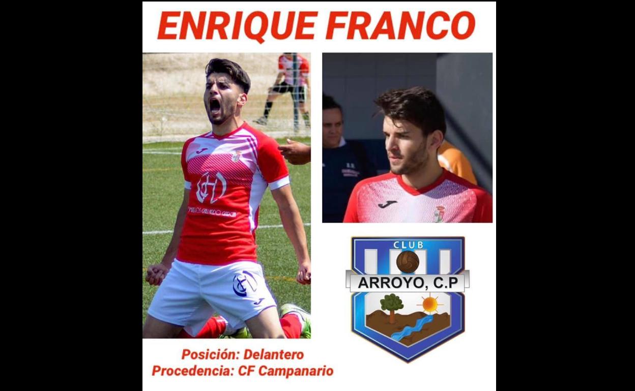Se trata de Enrique Franco, un delantero procedente del CF Campanario al que el club blanquiazul ha definido con los términos de «polivalencia, gol y competitividad», que llega a reforzar las primeras filas del Arroyo.
