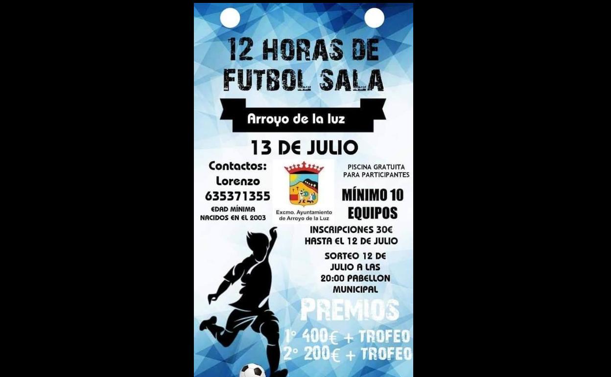 El día 13 del próximo mes de julio Arroyo de la Luz acogerá las 12 Horas de Fútbol Sala, organizadas por el Ayuntamiento de la ... localidad.