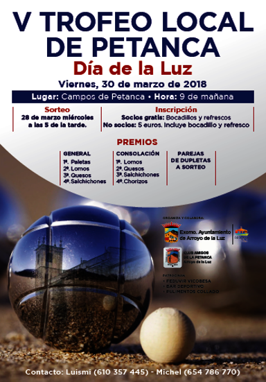 El 30 de marzo tendrá lugar el V Trofeo Local de Petanca Día de la Luz. Está organizado por el Club Amigos de la Petanca ... de Arroyo de la Luz, con la colaboración del Ayuntamiento de la localidad. Entre los colaboradores también se encuentran Feduvir Vicobesa, el Bar Deportivo y Pulimentos Collado.
