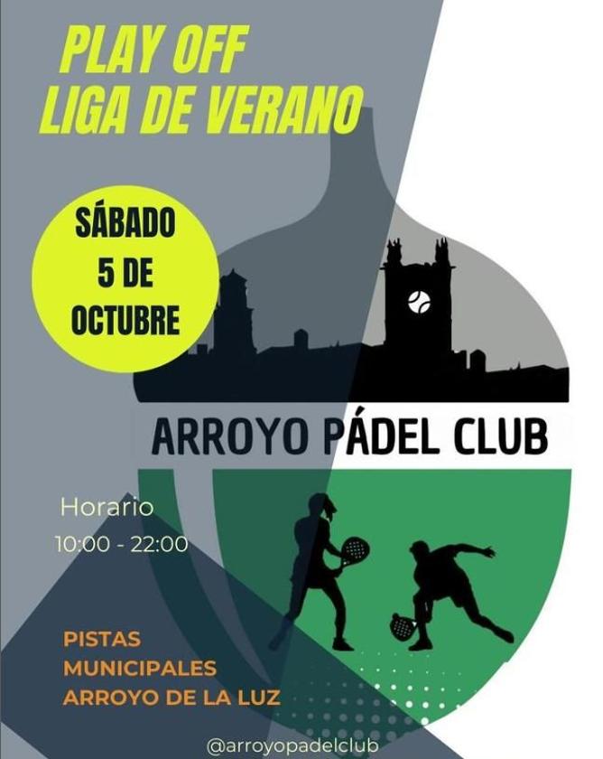 La Play Off está organizada por el Arroyo Pádel ClubDesde las 10.00 horas de hoy sábado, día 5 de octubre, y hasta las 22.00 horas, se podrá disfrutar en Arroyo de la Luz de 12 horas de pádel con los Play Off de la Liga de Verano.