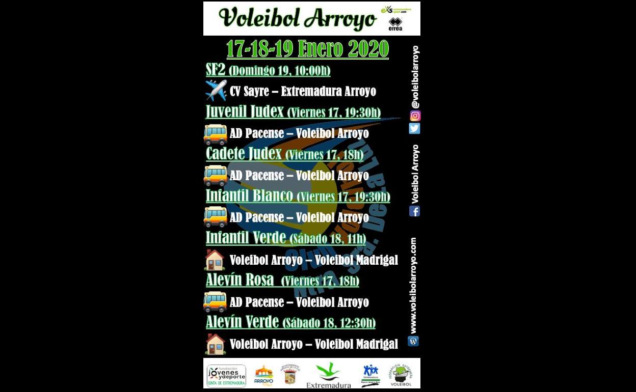 Mañana sábado, 18 de enero, las arroyanas del equipo infantil verde y alevín verde recibirán en casa a Voleibol Madrigal; las primeras jugarán a las 11.00 horas y las segundas a las 12.30 horas.